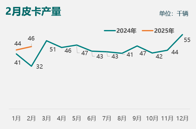 2025年2月,国内皮卡产量达到4.6万辆,同比增长45.8%。1-2月累计生产皮卡9万辆。