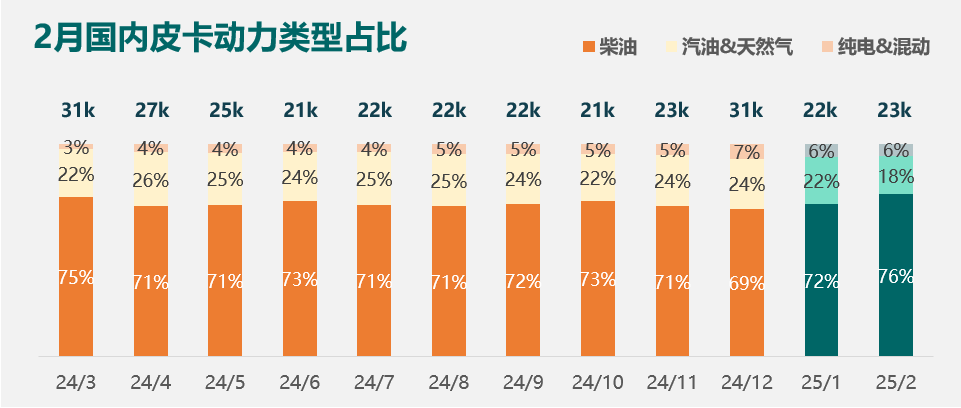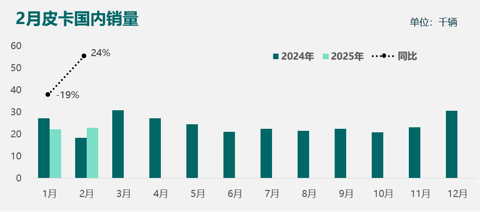 2025年1-2月,国内皮卡市场累计销量4.5万辆,同比下跌1.4%;单月看,2月国内皮卡销量为2.3万辆,同比增长24.1%,环比增加2.9%。