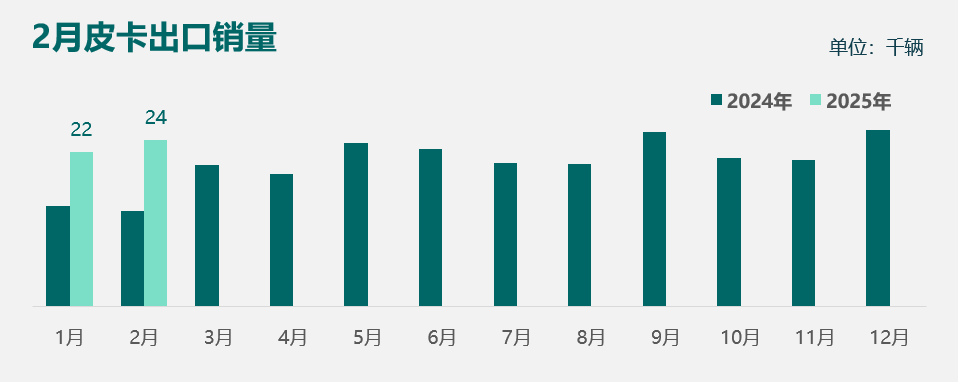 中汽协乘联会公开数据显示,2025年1-2月,国内皮卡累计出口4.6万辆,同比增加63.7%;2月皮卡出口总量2.4万辆,同比增幅达到73.5%。