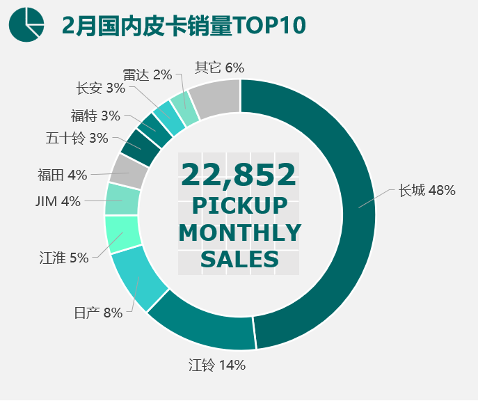 2月国内皮卡市场,销量前5的品牌为长城、江铃、日产、江淮以及JIM,TOP5市场分额达到78.9%。长城仍然保持第一,销量占比达到48.1%,大幅领先第二名的江铃;江铃与日产以14.1%及8.1%的占比稳居二三位;江淮排在第四,单月销量1100+;JIM则位列前五。