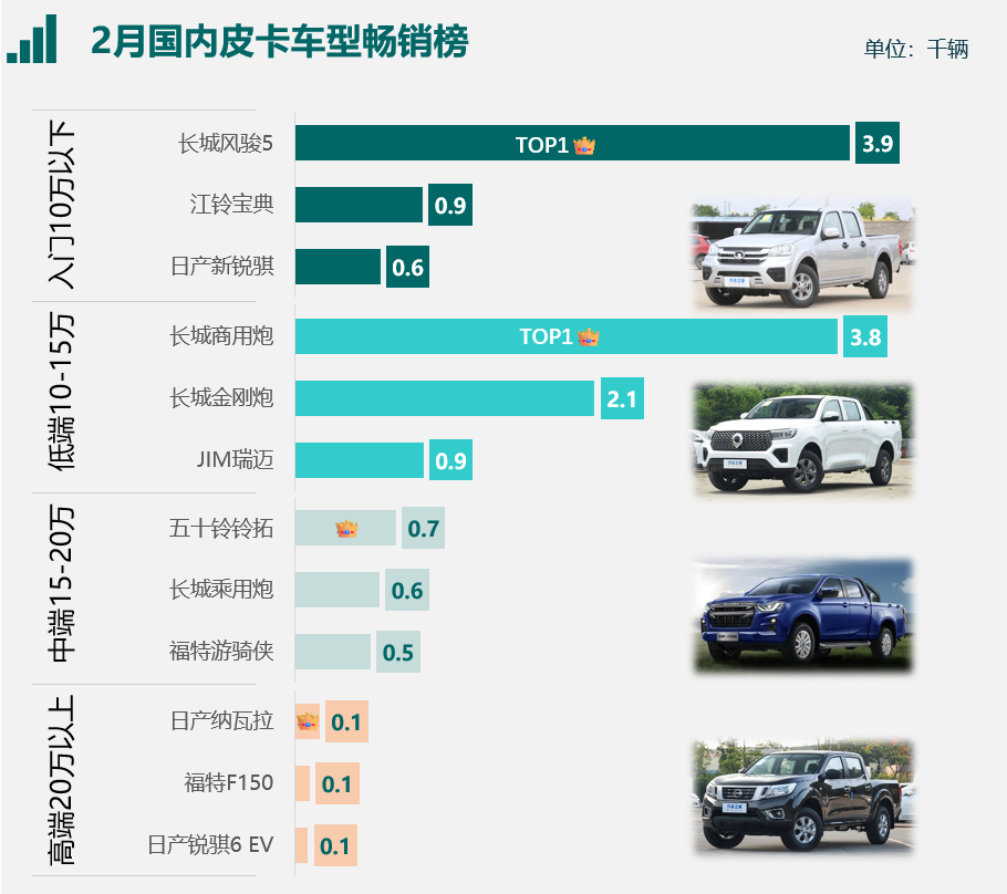 分价格段来看,长城依旧在中低端皮卡市场保持绝对的领先,其风骏5、商用炮分别以3900+、3800+的销量稳居各价格段第一;、铃拓在2月,夺得中端价格段市场的冠军;纳瓦拉则继续领跑高端皮卡市场。