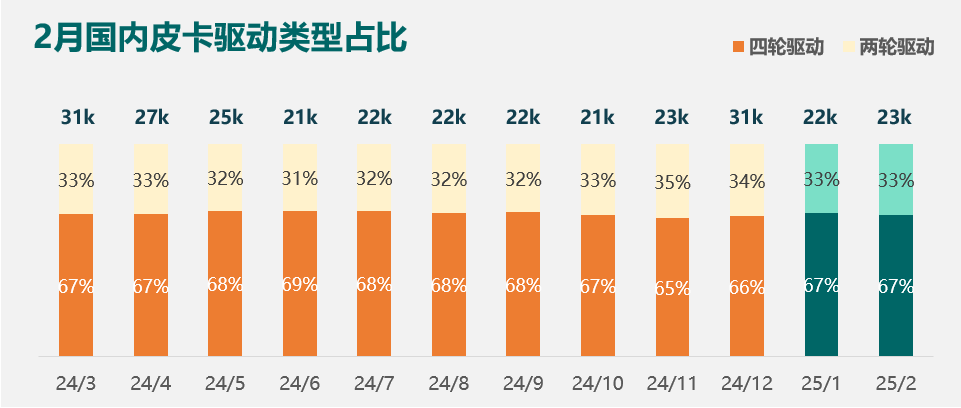分驱动形式来看,2025年2月,四驱车型占比为67%,依然占据主导地位,和去年同期相比,四驱车型销量的绝对值增长21.4%,占比下滑1.5%。