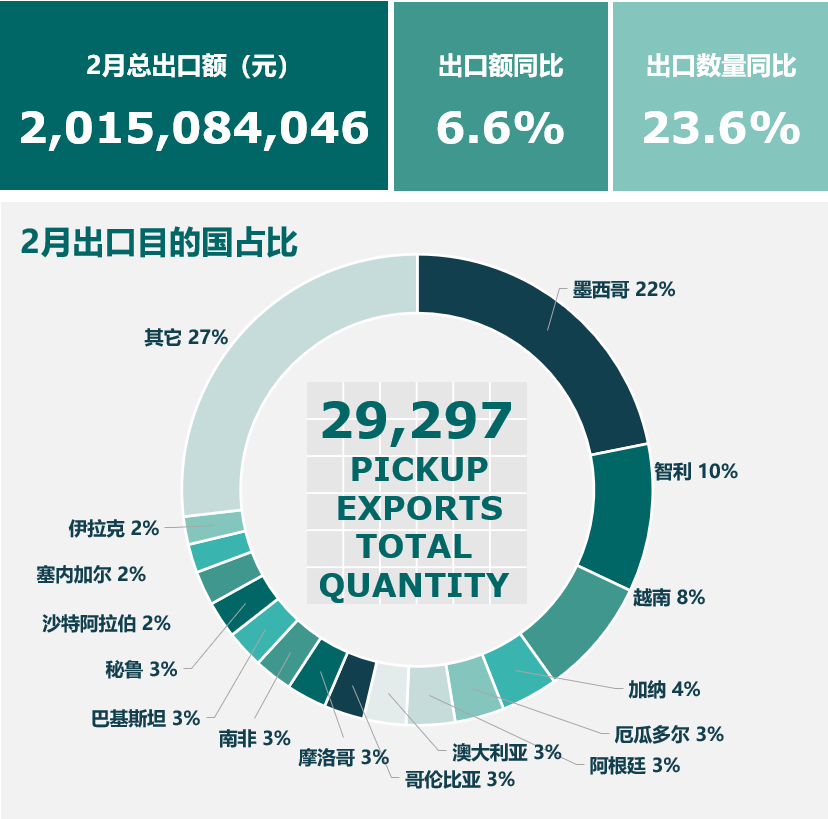 2025年1-2月国内皮卡累计销量4.5万辆,同比下跌1.4%,但新能源皮卡销售却创新高,1-2月累计销量2600+辆,同比上涨114.5%;出口方面,1-2月国内皮卡累计出口4.6万辆,同比增加63.7%,长城、上汽大通、比亚迪领跑2月皮卡出口市场。