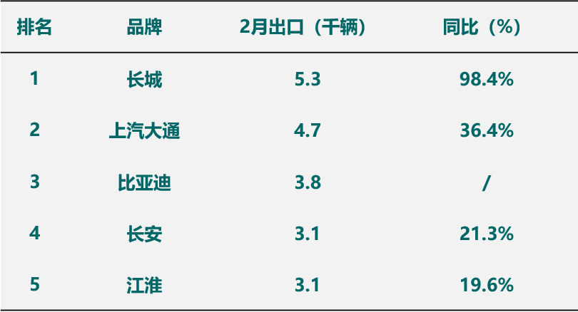 根据中汽协乘联会公开数据,2025年2月皮卡出口2.4万辆,同比上涨73.5%。分品牌来看,长城以5300+的出口量跃居第一,上汽大通以4700+的销量紧跟其后,两者同比分别上涨98.4%、上涨36.4%;比亚迪、长安分列第三第四;2月,江淮以3100+的出口量排在第五,同比上涨19.6%。