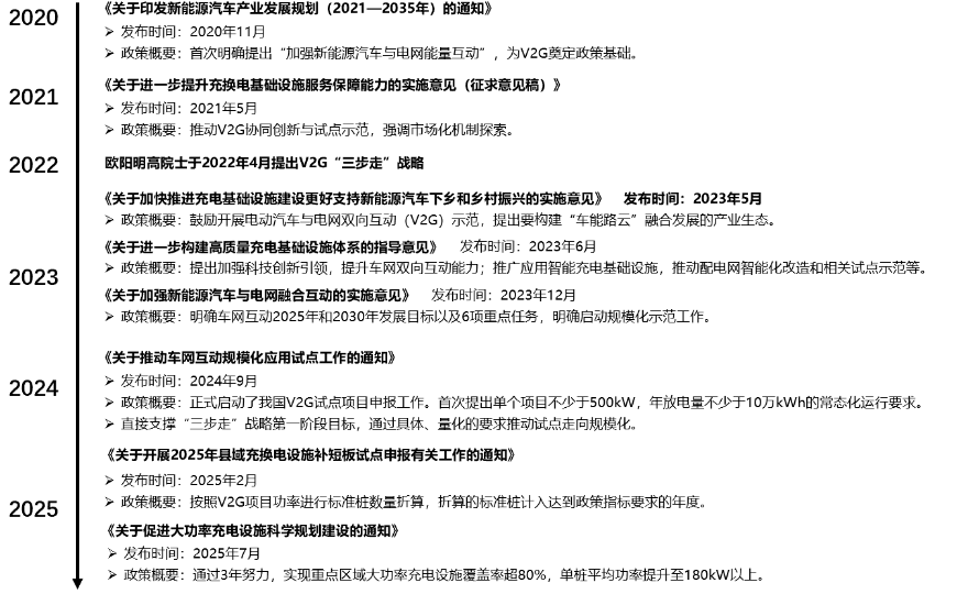 2014 年发改委〔2014〕1668 号完善分时电价机制,为 V2X 提供可结算的价差;2015 年《加快电动汽车充电基础设施建设的指导意见》(国办发〔2015〕73 号)提出标准统一与平台互联互通,强调车网双向互动,标志从接口层到政策统筹的转折。2020 年《新能源汽车产业发展规划(2021—2035 年)》首次明确“加强新能源汽车与电网(V2G)能量互动”。此后中央层面密集出台政策,推动车网互动由技术试点迈向规模化应用,并通过辅助服务、现货市场等机制注入市场化动力。纬迪咨询为大家整理了2020—2025 年V2X的相关政策脉络: