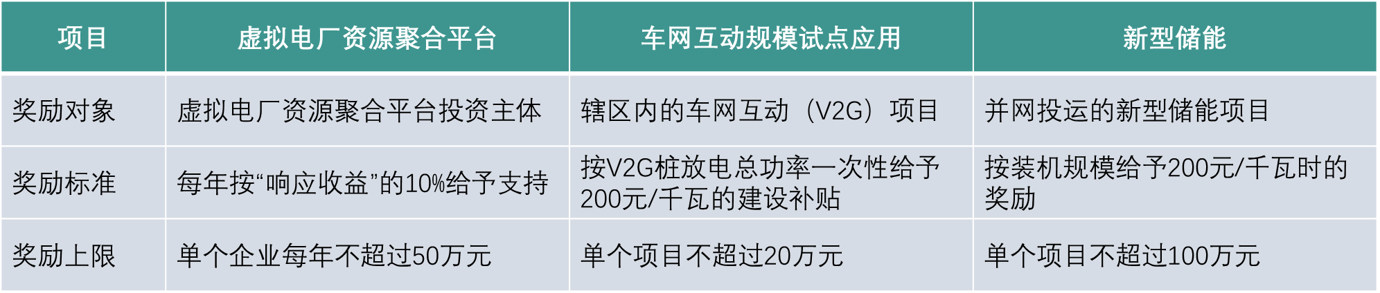 首批试点城市普遍采用的落地措施有三类:①基础设施建设补贴,侧重降前期成本,覆盖双向充放电桩、站端改造、计量与通信等硬件投入;②VPP补贴,对“虚拟电厂”按照可用容量和实际响应电量的补贴;③充放电补贴/优惠结算,在峰谷价之外,叠加低谷充电优惠、放电(回馈电网或园区)结算加成、服务费减免等。试点城市具体政策如下图所示: