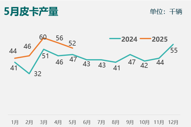 2025年5月,国内皮卡产量达到5.2万辆,同比增长10.0%。1-5月累计生产皮卡26万辆。