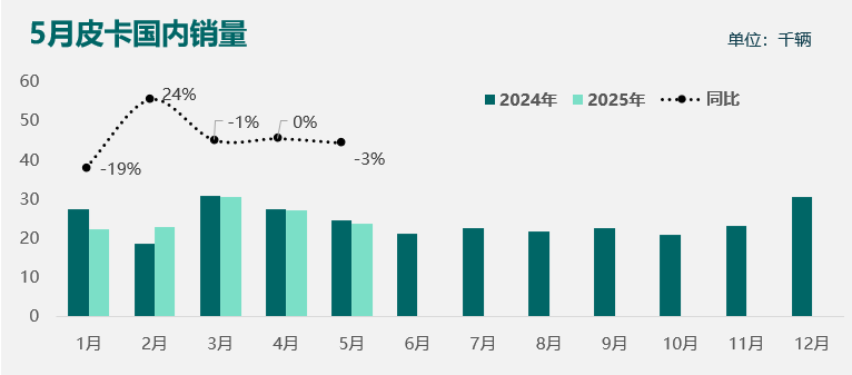 2025年1-5月,国内皮卡市场累计销量12.6万辆,同比下降1.5%;单月看,5月国内皮卡销量为2.4万辆,同比下降3%,环比下降12.2%。
