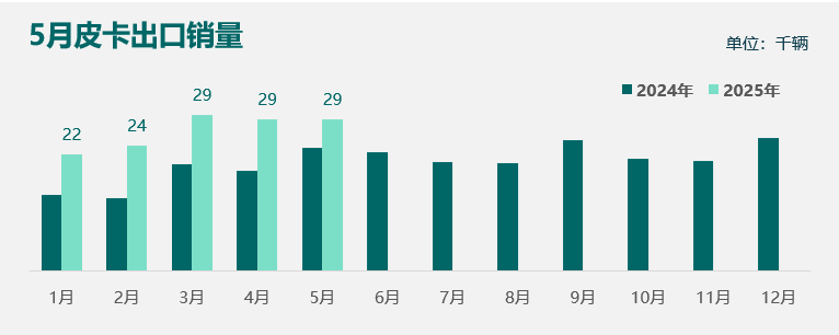 中汽协乘联会公开数据显示,2025年1-5月,国内皮卡累计出口13.2万辆,同比增幅达46.8%;5月皮卡出口总量2.9万辆,同比增长23.3%。