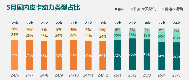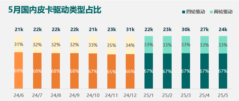 分驱动形式来看,2025年5月,四驱车型占比为67%,依然占据主导地位。一方面,西南、西北以及东北地区的皮卡销量占比较高,四驱车型能更好地适应这些地区多山地、路面泥泞或冰雪路面的路况;另一方面,皮卡乘用化叠加越野改装的用户趋势,也是四驱车型销量占比较高的一个重要原因。