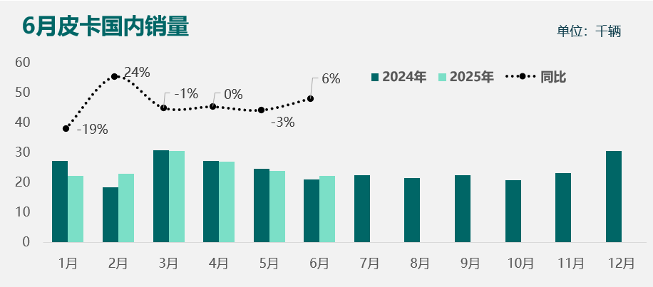 2025年1-6月,国内皮卡市场累计销量14.9万辆,同比下降0.5%;单月看,6月国内皮卡销量为2.2万辆,同比增加6.1%,环比下降6.1%。