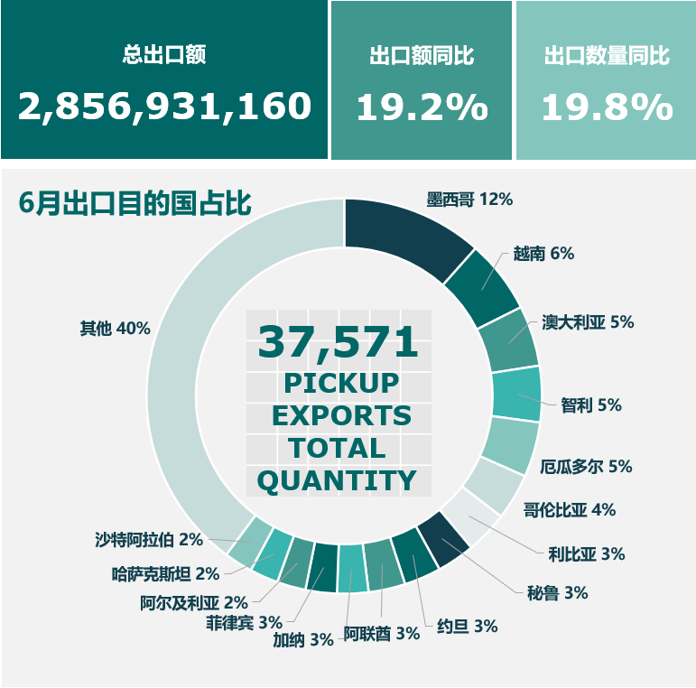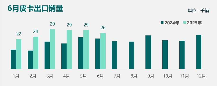 中汽协乘联会公开数据显示,2025年1-6月,国内皮卡累计出口15.8万辆,同比增幅达41.2%;6月皮卡出口总量2.6万辆,同比增长18.4%。
