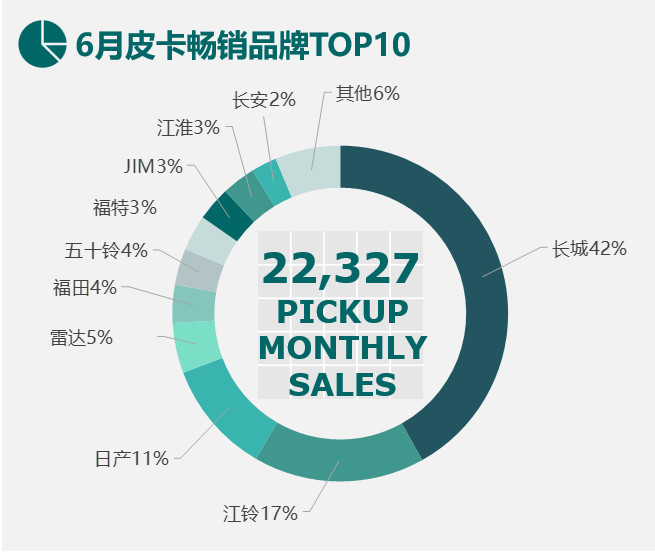 6月国内皮卡市场,前5的位置仍然被长城、江铃、日产、雷达、福田这几个品牌所占据,TOP5市场分额达到78%。其中长城虽然一直保持第一,且大幅领先第二名的江铃,但差距正在逐月缩小;反观江铃与日产,凭借各自新车型,新宝典以及元野Z9的出色表现,市场分额稳步提升。