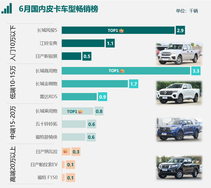 分价格段来看,长城依旧在中低端皮卡市场保持绝对的领先,其风骏5、商用炮、乘用炮分别以2800+、3200+、800+的销量稳居各价格段第一;日产纳瓦拉则继续领跑高端皮卡市场。
