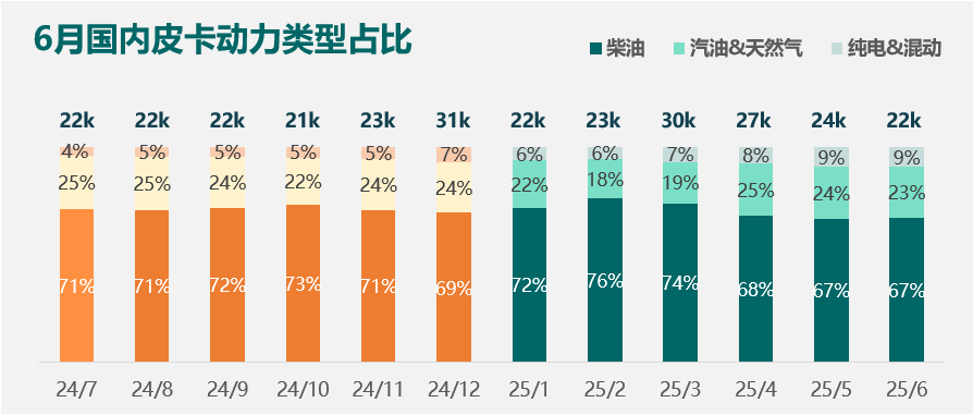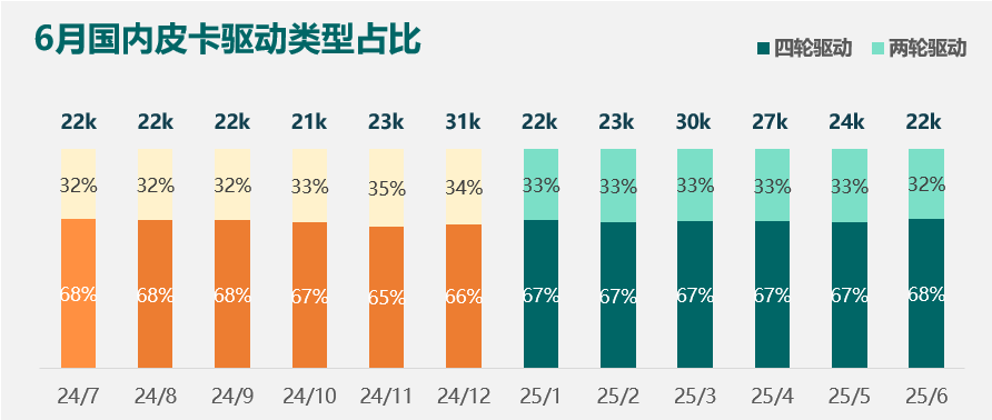 分驱动形式来看,2025年6月,四驱车型占比为68%,依然占据主导地位。四驱车型作为内蒙古、新疆及东北等地区高海拔、易结冰路况的刚需,其基本盘非常稳固;此外对于中高端市场来说,对皮卡的通过性能要求更高,对价格敏感度反而较低,也是四驱车型的强势区;两驱车的主力市场还是在于家商两用的群体,以及追求性价比、看重燃油经济性的客户。