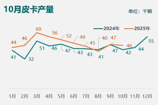 2025年10月,国内皮卡产量达到4.6万辆,同比增长9.6%。1-10月累计生产皮卡48.4万辆。