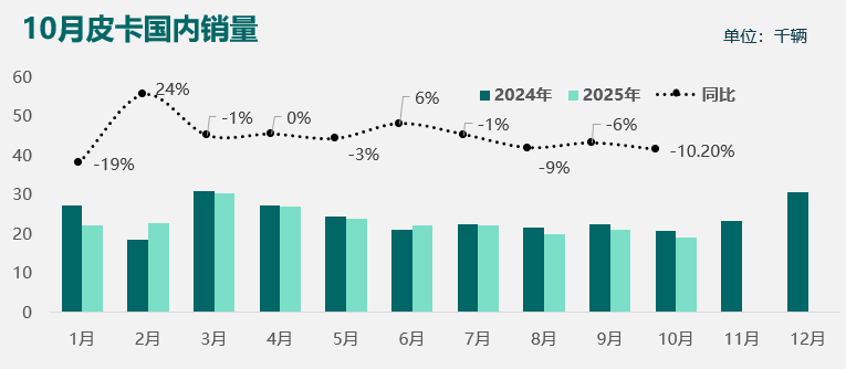 2025年1-10月,国内皮卡市场累计销量23.1万辆,同比下跌2.6%;单月看,10月国内皮卡销量为1.9万辆,同比下滑10.2%,环比下降11.3%。