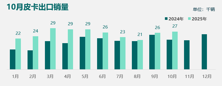 中汽协乘联会公开数据显示,2025年1-10月,国内皮卡累计出口25.5万辆,同比增加28.4%;10月皮卡出口总量2.7万辆,同比增幅达到28.4%。