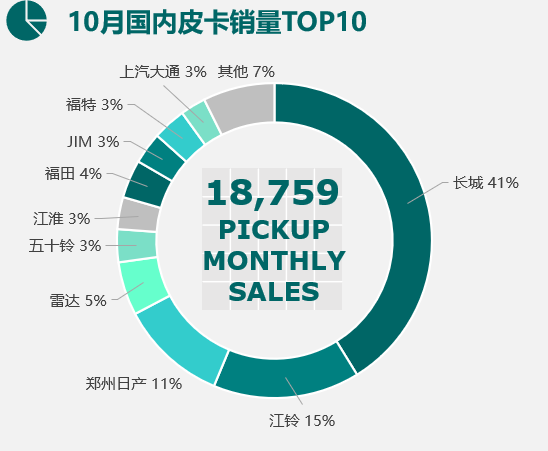 10月国内皮卡市场,销量前5的品牌为长城、江铃、郑州日产、雷达以及五十铃,TOP5市场分额达到77.5%。长城仍然保持第一,销量占比达到41.2%,大幅领先第二名的江铃;江铃与郑州日产表现稳定,分额维持在10%以上;雷达稳居第四,单月销量900+;五十铃在本月销量挤进前五。