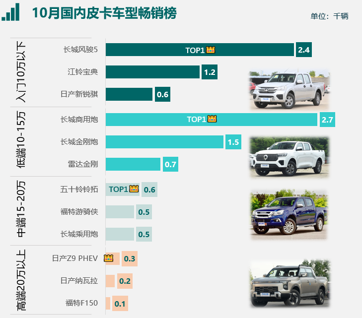 2025年1-10月国内皮卡累计销量23.1万辆,同比下跌2.6%,但新能源皮卡销售却创新高,1-10月累计销量19100+辆,同比上涨115.2%;出口方面,1-10月国内皮卡累计出口25.5万辆,同比增加28.4%,长安、长城、上汽大通领跑10月皮卡出口市场。