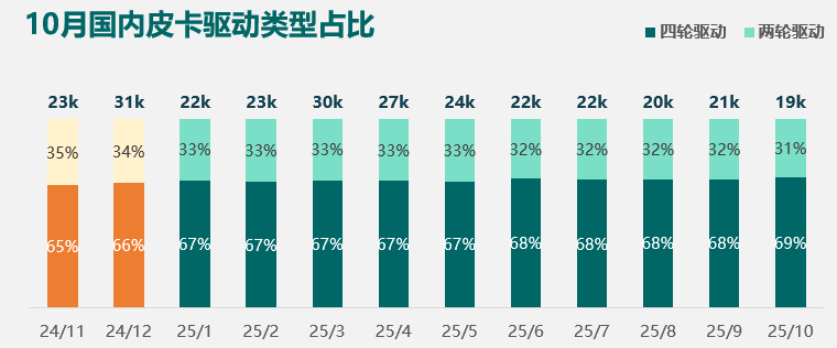 分驱动形式来看,2025年10月,四驱车型占比为69.4%,依然占据主导地位,和去年同期相比,四驱车型销量的绝对值下滑6.4%,占比增长2.8%。