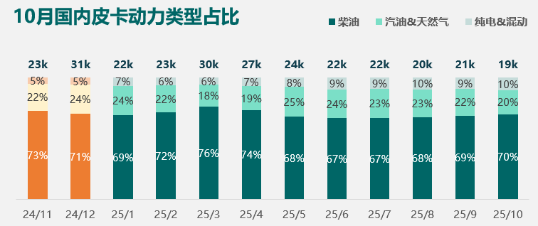 分动力类型来看,2025年10月,柴油皮卡销量占比70%,汽油&天然气占比为20%,环比上月,柴油比例上升而汽油比例下降。同比来看,新能源皮卡占比,从去年同期的5%,上升到现在的10%,销量同比增长80.9%。
